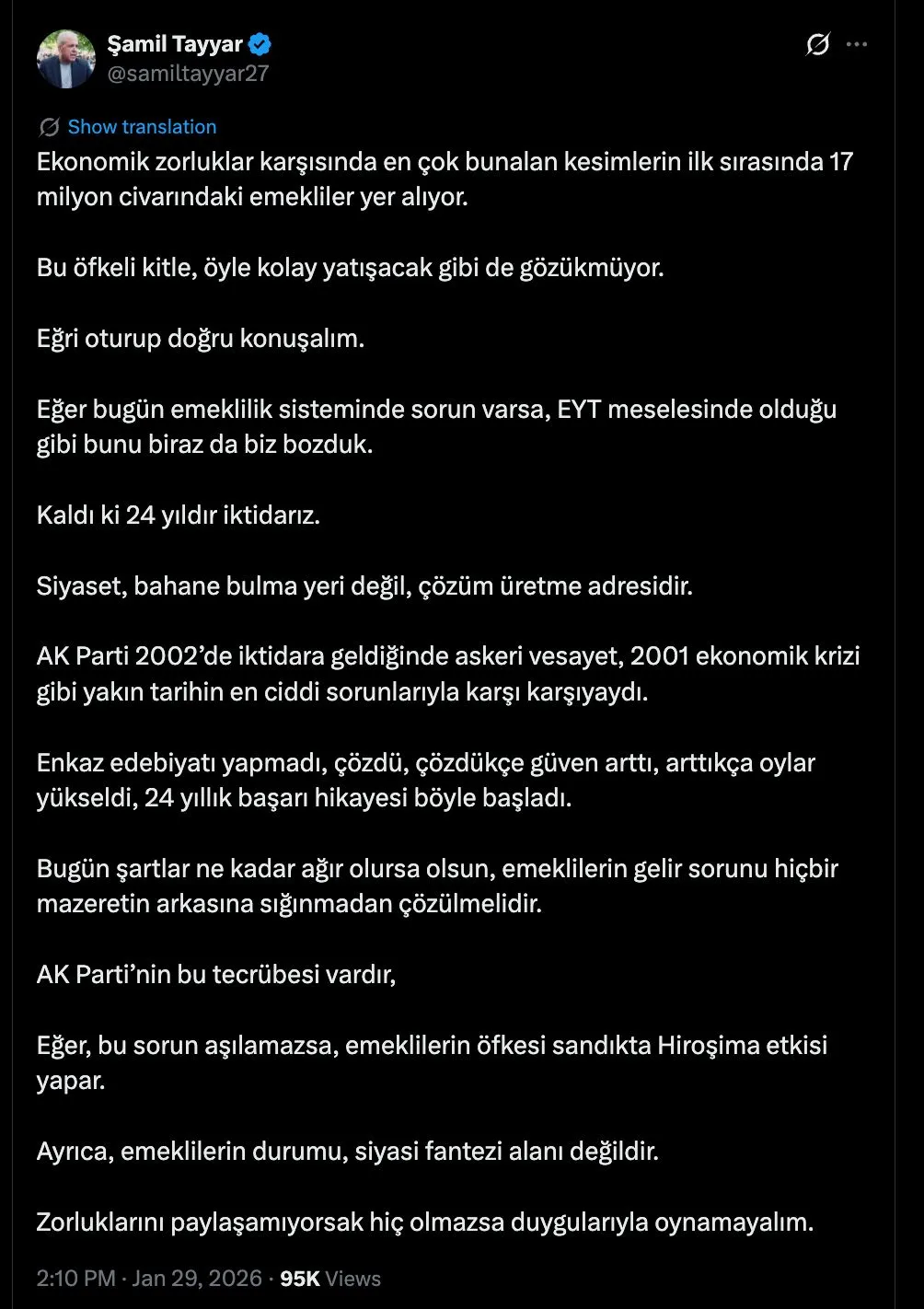 Eski AK Parti Milletvekili Şamil Tayyar, sosyal medya hesabından yaptığı paylaşımda emeklilerin yaşadığı ekonomik sıkıntılara dikkat çekerek "Ekonomik zorluklar karşısında en çok bunalan kesimlerin ilk sırasında 17 milyon civarındaki emekliler yer alıyor. Bu öfkeli kitle, öyle kolay yatışacak gibi de gözükmüyor. Eğri oturup doğru konuşalım. Eğer bugün emeklilik sisteminde sorun varsa, EYT meselesinde olduğu gibi bunu biraz da biz bozduk. Kaldı ki 24 yıldır iktidarız. Siyaset, bahane bulma yeri değil, çözüm üretme adresidir" dedi.