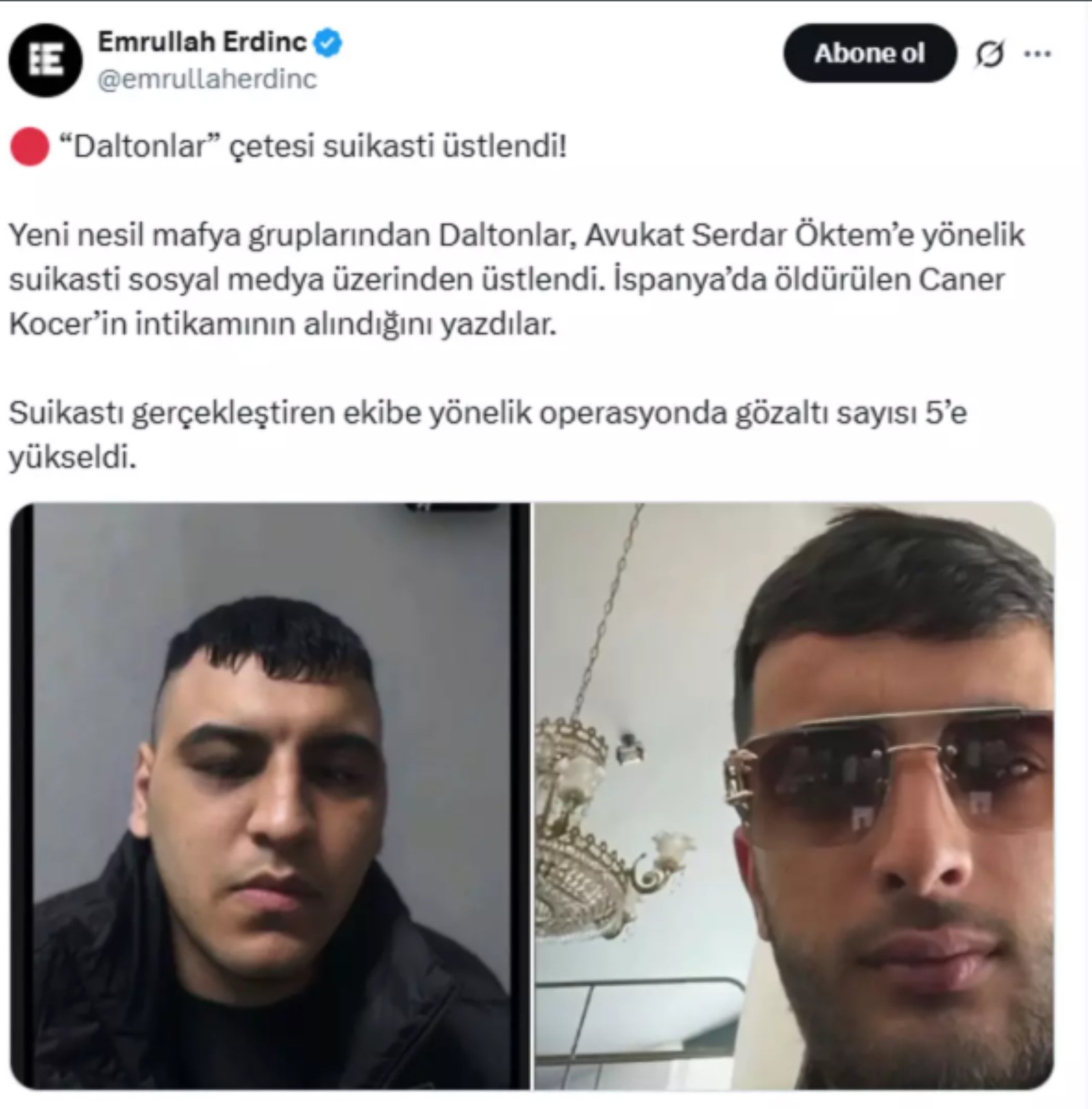 Erdinç'in açıklamasına göre Daltonlar, cinayeti İspanya'da öldürülen Caner Kocer'in intikamı nedeniyle işledi.