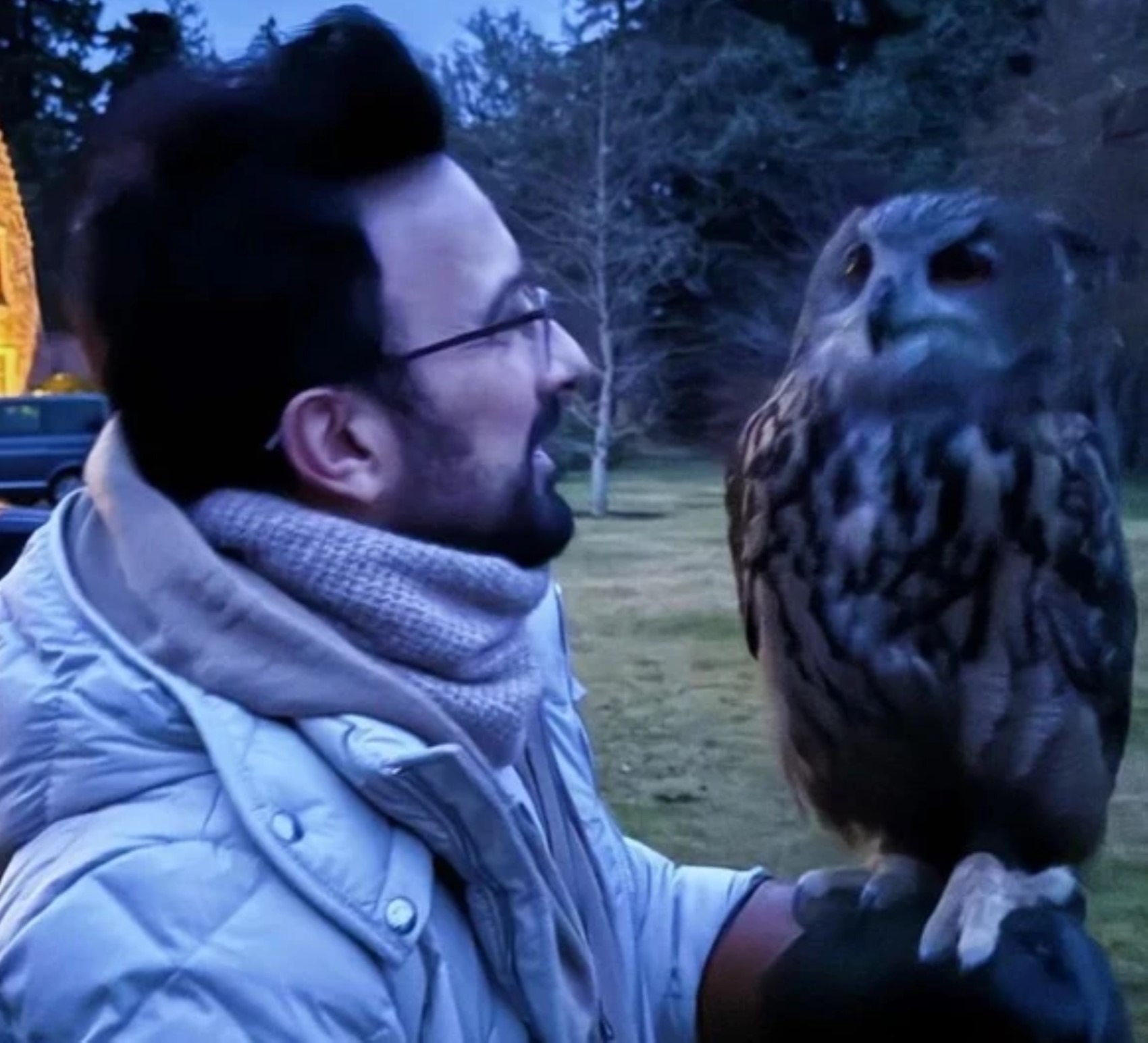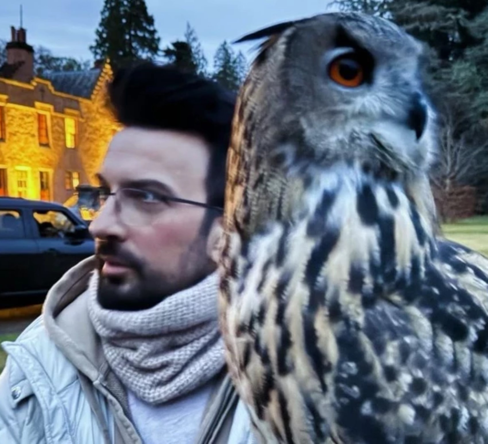 Yaşamını uzun bir süredir eşi Pınar Tevetoğlu ile kızı Lina Tevetoğlu ile birlikte Almanya'da sürdüren ünlü şarkıcı, puhu kuşuyla poz verdi.