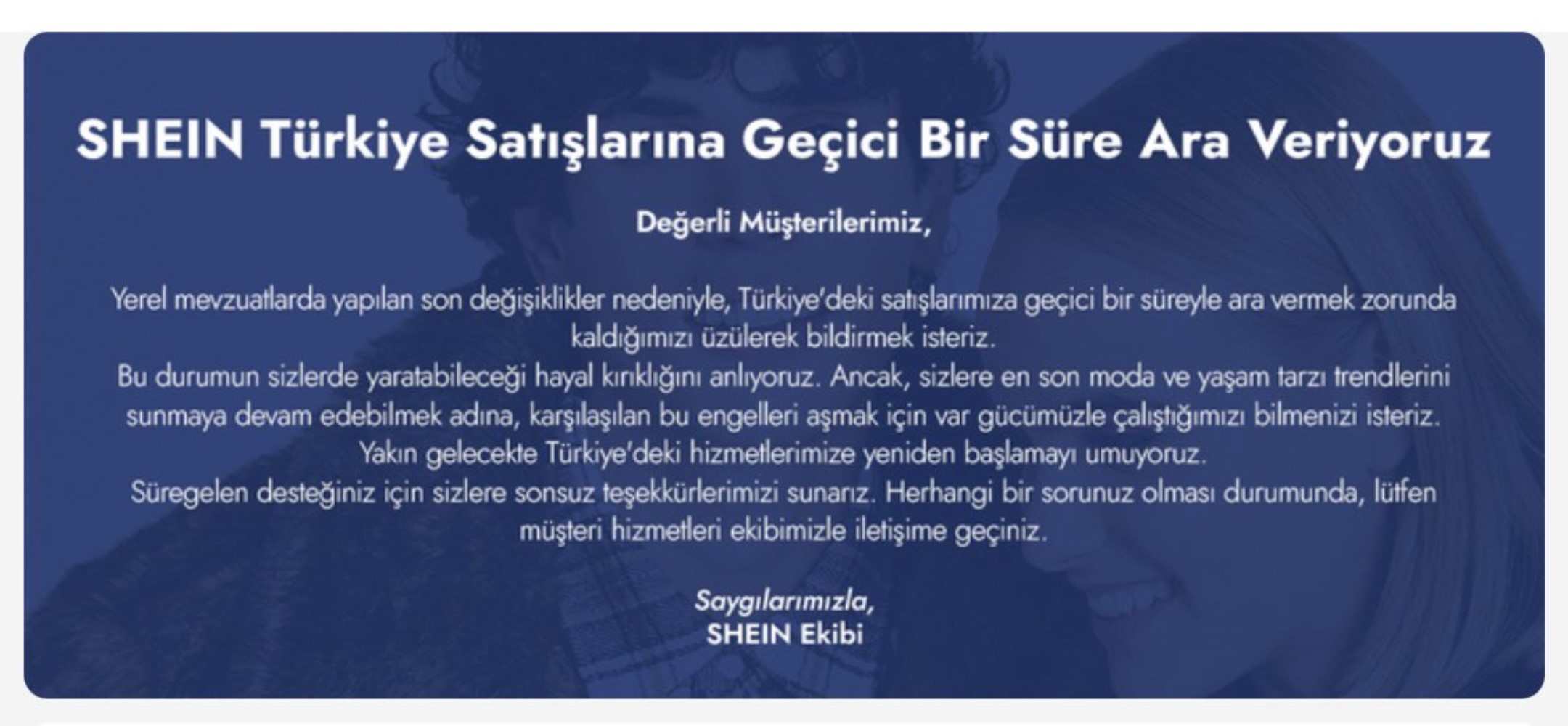 SHEIN, müşterilerine yönelik yaptığı yazılı açıklamada, yerel düzenlemelerde yapılan son değişiklikler nedeniyle Türkiye’deki satışlarına ara vermek zorunda kaldıklarını bildirdi. Şirket, bu sürecin kullanıcılar üzerinde hayal kırıklığı yaratabileceğinin farkında olduklarını vurguladı.