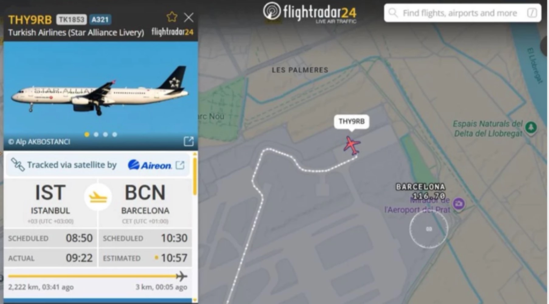 İspanyol basını Türk Hava Yolları'na ait İstanbul-Barcelona seferini yapan uçağın asılsız bir bomba ihbarı nedeniyle El Prat Havalimanı'na acil iniş yapmasıyla ilgili detayları açıkladı. Hava trafiği bilgilendirme portalı FlightRadar verilerine göre, TK1853 sefer sayılı uçak 09:22'de İstanbul'dan havalandı.