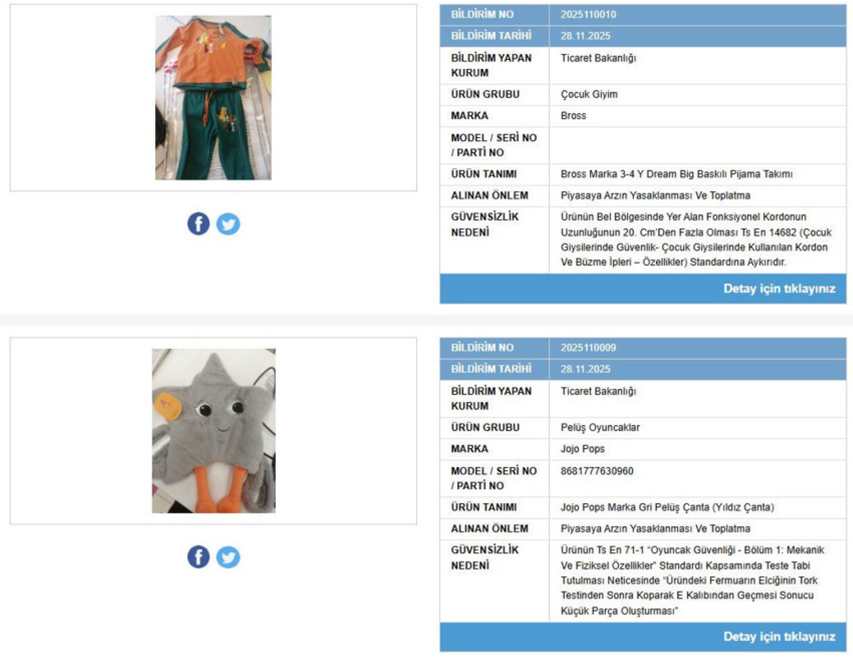 Ticaret Bakanlığı, piyasa gözetimi ve denetimi faaliyetleri kapsamında güvensiz ürünleri belirlemeye devam ediyor. Son denetimlerde, Bross markasına ait bir çocuk giyim ürünü ile Jojo Pops markalı bir oyuncağın güvenli olmadığı tespit edildi.