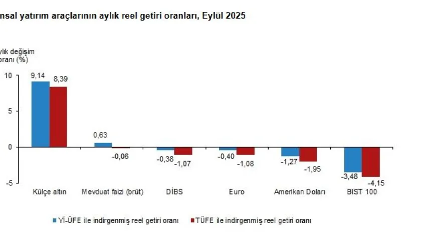 TÜİK, Eylül 2025 dönemine ilişkin finansal yatırım araçlarının reel getiri oranlarını açıkladı. Buna göre; aylık en yüksek reel getiri, yurt içi üretici fiyat endeksi (Yİ-ÜFE) ile indirgendiğinde yüzde 9,14, tüketici fiyat endeksi (TÜFE) ile indirgendiğinde ise yüzde 8,39 oranlarıyla külçe altında gerçekleşti. Yİ-ÜFE ile indirgendiğinde; yatırım araçlarından, mevduat faizi (brüt) yüzde 0,63 oranında yatırımcısına reel getiri sağlarken, devlet iç borçlanma senetleri (DİBS) yüzde 0,38, avro yüzde 0,40, Amerikan doları yüzde 1,27 ve BIST 100 yüzde 3,48 oranlarında yatırımcısına kaybettirdi. TÜFE ile indirgendiğinde ise mevduat faizi (brüt) yüzde 0,06, DİBS yüzde 1,07, avro yüzde 1,08, Amerikan doları yüzde 1,95 ve BIST 100 yüzde 4,15 oranlarında yatırımcısına kaybettirdi.