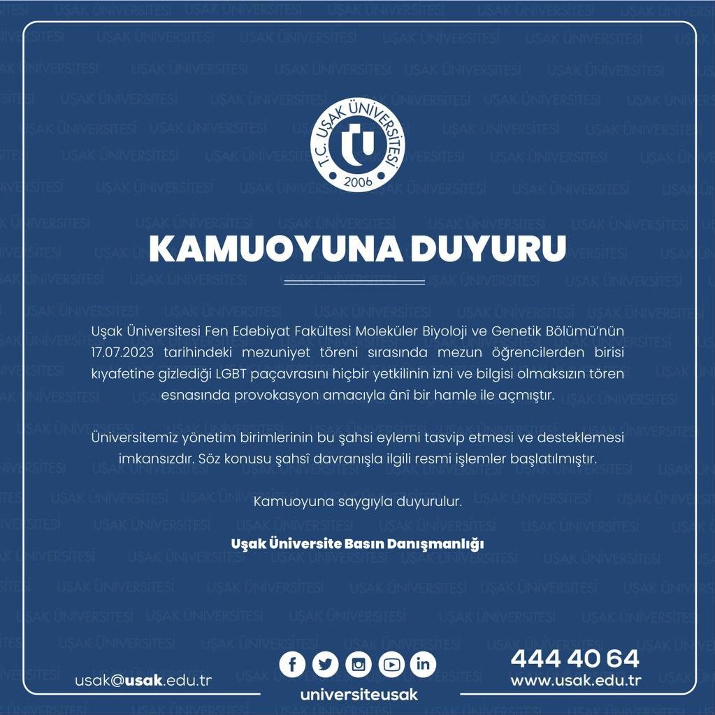 ''Uşak Üniversitesi Fen Edebiyat Fakültesi Moleküler Biyoloji ve Genetik Bölümü'nün 17.07.2023 tarihindeki mezuniyet töreni sırasında mezun öğrencilerden biri kıyafetine gizlediği LGBT paçavrasını hiçbir yetkilinin izni ve bilgisi olmaksızın tören esnasında provokasyon amacıyla ani bir hamle ile açmıştır''